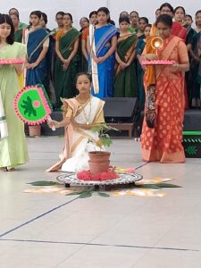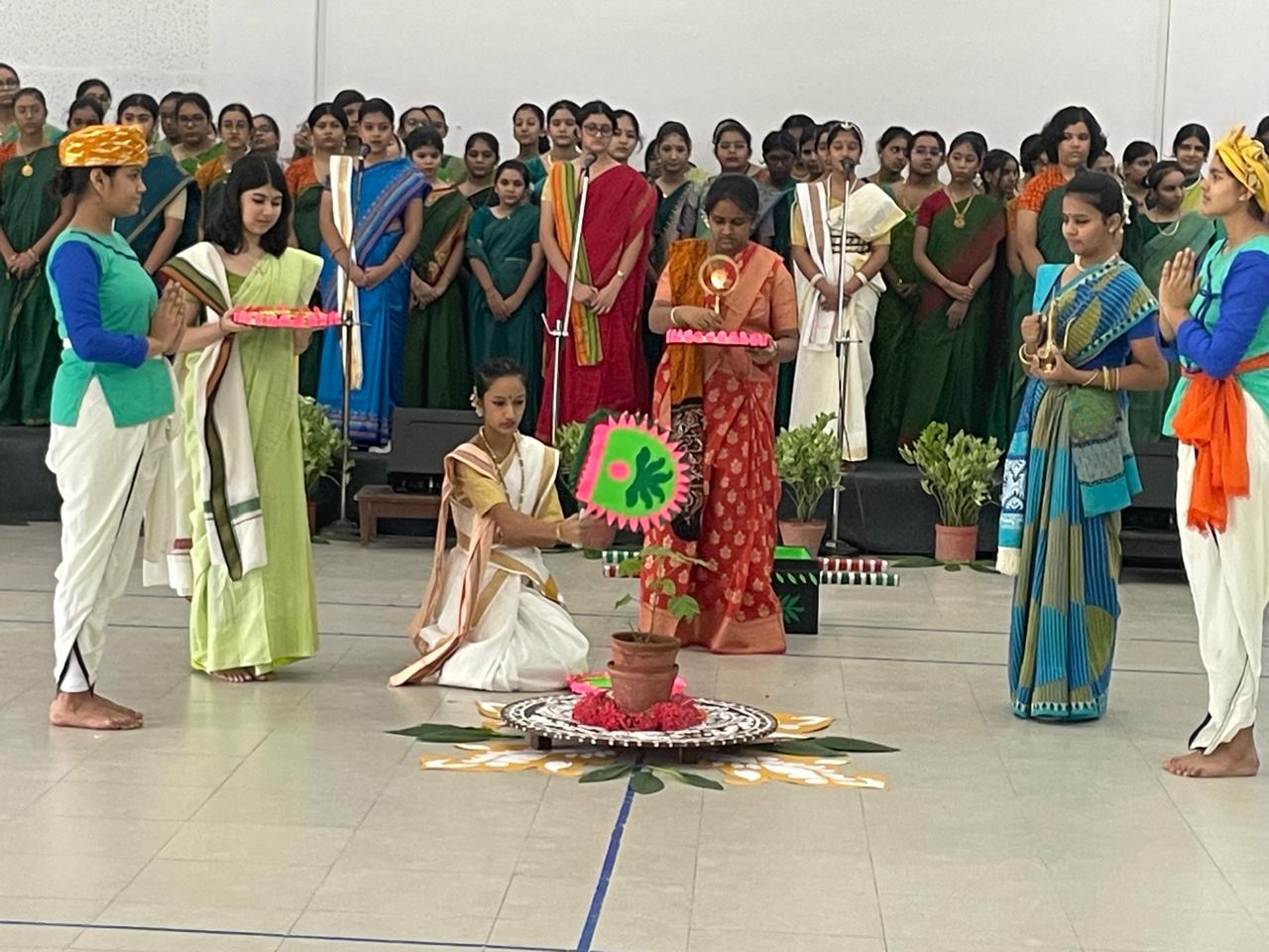On 8th August, 2025, the students of Class 8 of Modern High School for Girls transported everyone to the picturesque and serene Santiniketan, where Tagore or Kobi Guru Rabindranath Thakur, as we, the Bengalis felicitate him, started the ‘Vriksharopan Utsav’ on July 14, 1929 by planting a ‘bokul’ sapling. Modern High School for Girls has kept the legacy alive with its annual ‘vriksharopan’ (tree planting) ceremony where at the end of the ceremony, the sapling is planted in the school garden. The ceremony was an expression of the bard’s love for Nature and his strong belief that a deep sense of harmony binds every element of Nature. The various songs and dances, as well as narration, all performed by the young and talented students of Class 8, highlighted Tagore’s legacy of protecting the environment. The beautiful flower ‘alpana’ is an artistic expression of Tagore’s cherished ideals of ‘Satyam, Shivam, Sundaram’ – ‘Truth, Beauty and Compassion’ ; which is also the vision of our school. The ceremony was a celebration of the sacred communion between Nature and the human soul and compelled us to acknowledge and recognize Nature as a friend, philosopher and guide.